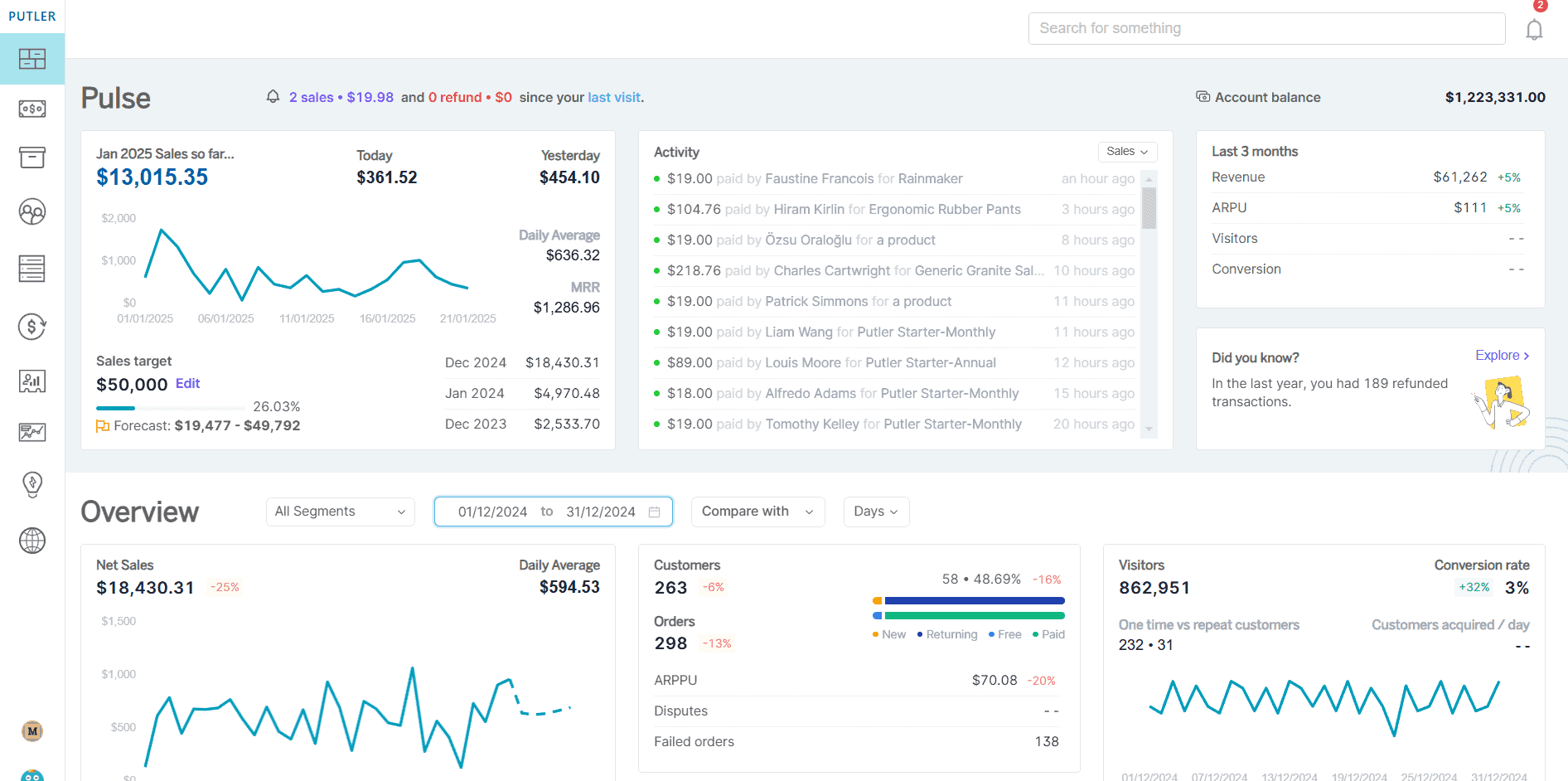 - Putler: Segmenting customers in Putler is so much easier. It offers RFM analysis which automatically segments your customers. But that’s not all, Putler also comes with a treasure trove of filters. With Putler, you can sort customers by location, refund rates, quantity sold, and much more with just a click.