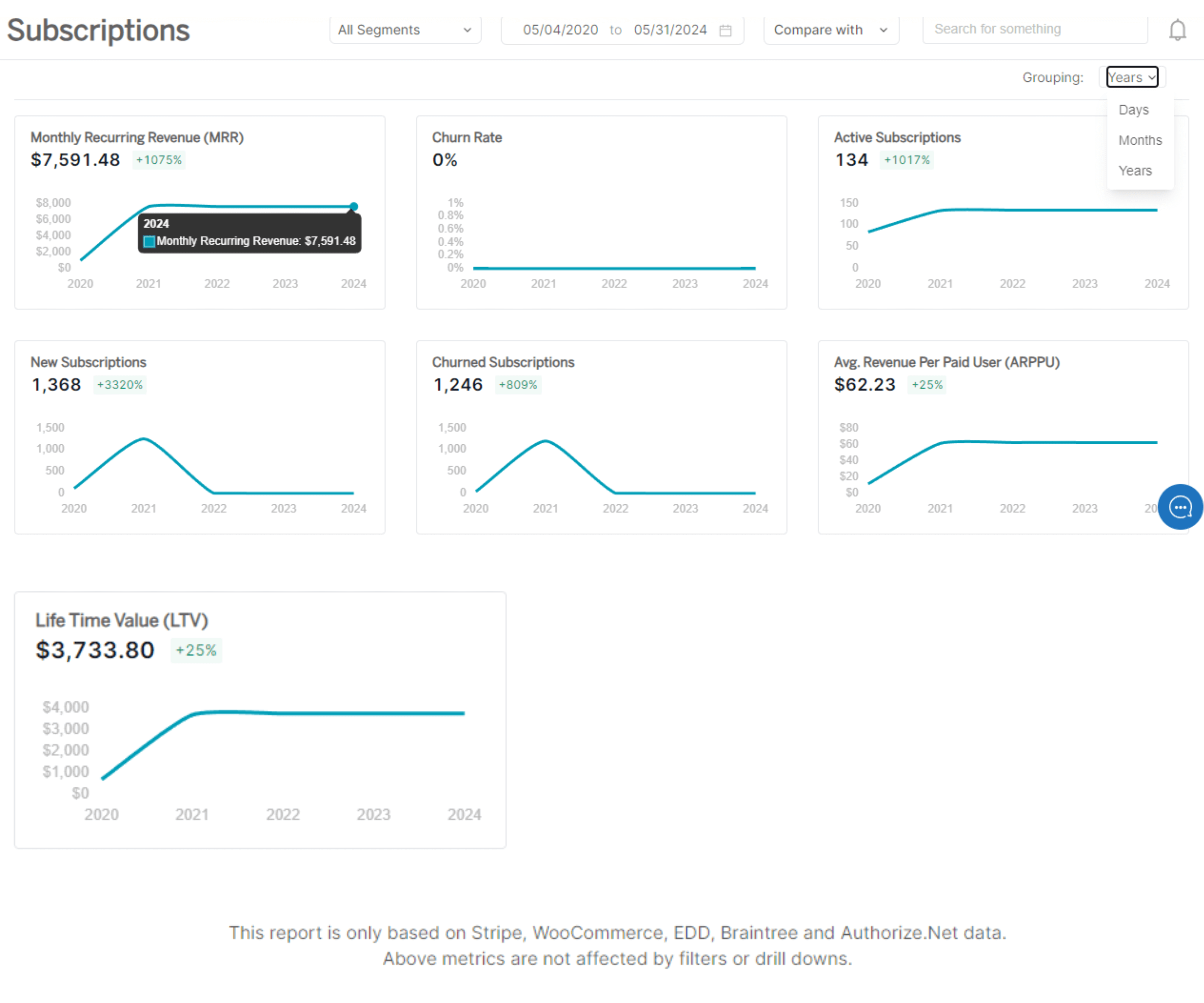 For a comprehensive view, use the Subscriptions dashboard to group your data by days, months, or years