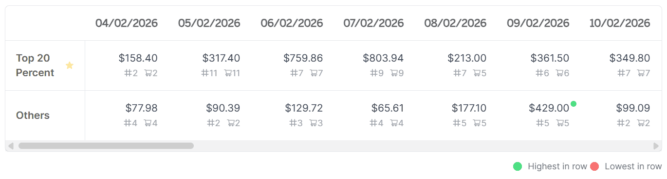 Average price: Groups products by price tier. Most of your sales probably cluster in one range. If there’s an untapped premium tier that a few products are quietly proving works, this is where you spot the opportunity.