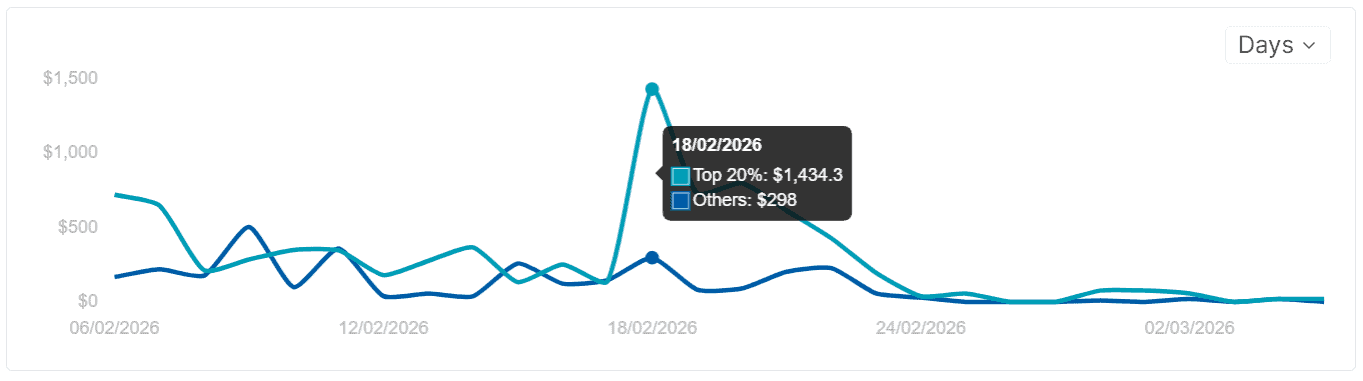 Above the list, an 80/20 breakdown chart tracks how the split changes over time.