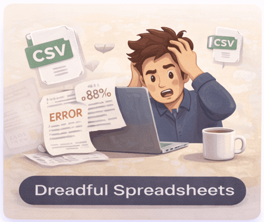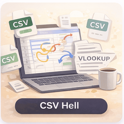 Finance teams routinely download up to eight separate CSV files, pull them into Excel, and run VLOOKUPs to piece together a complete picture.
